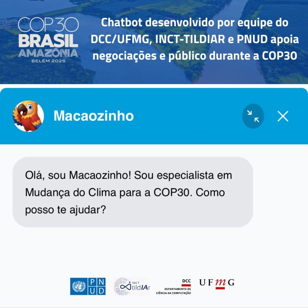 A COP30, Conferência das Nações Unidas sobre as Mudanças Climáticas, está em andamento no Brasil, reunindo líderes e especialistas de mais de 190 países em busca de soluções concretas para o enfrentamento da crise climática. Além dos debates e compromissos ambientais, a tecnologia brasileira também marca presença nesta edição do evento — com o Macaozinho, um chatbot desenvolvido de forma colaborativa por pesquisadores e estudantes do Departamento de Ciência da Computação (DCC) da UFMG, do Instituto Nacional de Ciência e Tecnologia em Inteligência Artificial Responsável (INCT-TILDIAR) e pelo Programa das Nações Unidas para o Desenvolvimento (PNUD).