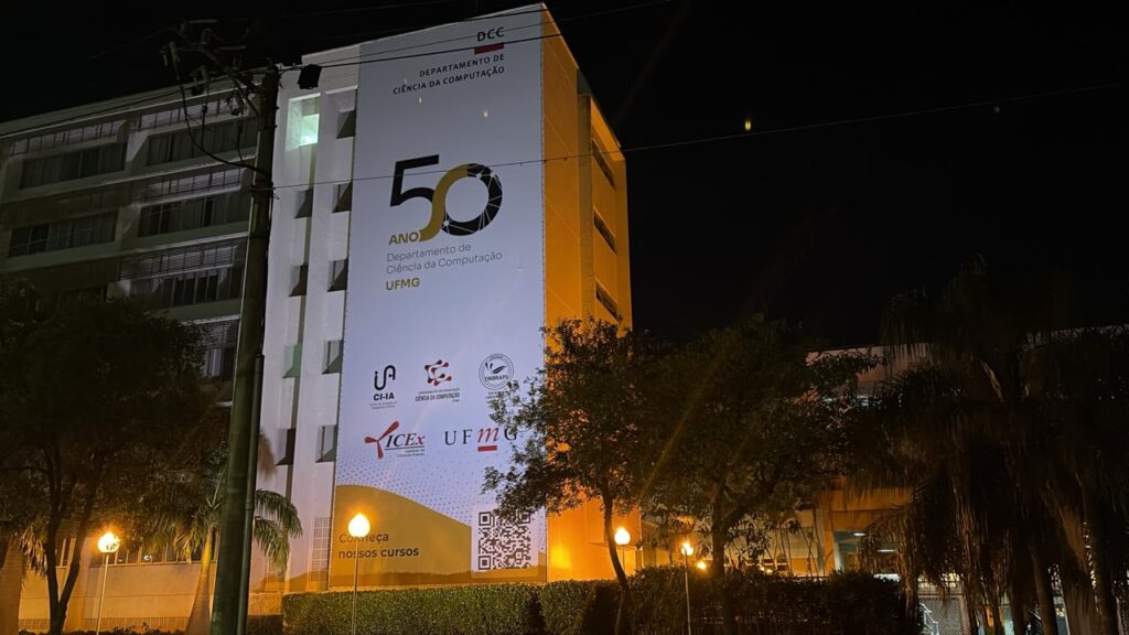 A fachada do Departamento de Ciência da Computação (DCC) ganhou um novo elemento visual que já se tornou ponto de destaque no campus Pampulha da Universidade Federal de Minas Gerais. A instalação de um painel de 25 metros de altura inaugurou oficialmente as ações comemorativas pelos 50 anos do DCC, celebrados ao longo deste ano.