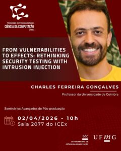 Na próxima quinta-feira, 2, na sala 2077 do ICEx, como parte dos Seminários da Pós, o professor da Universidade de Coimbra, Charles Ferreira Gonçalves, irá proferir uma palestra sobre testes de segurança com injeção de intrusão. O evento é gratuito, não exige inscrição prévia e é aberto ao público.