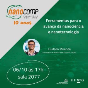 Na sexta-feira, 06/10, às 17 horas, na sala 2077 do Instituto de Ciências Exatas (ICEx), continuando as comemorações dos dez anos do Laboratório do Departamento de Ciência da Computação (DCC) da UFMG, NanoComp, o cofundador e diretor-executivo da FabNS, Hudson Miranda, irá proferir a palestra “Ferramentas para o avanço da nanociência e nanotecnologia”.