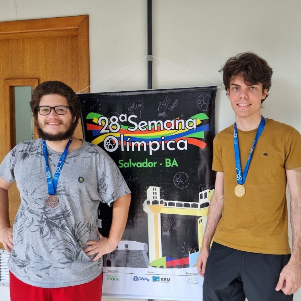 Os estudantes do Departamento de Ciência da Computação, do curso de Matemática Computacional, Gustavo Neves da Cruz e Gabriel Ubiratan Barreto Pereira de Oliveira, receberam, no final de janeiro/início de fevereiro de 2025, em Salvador, Bahia, durante a Semana Olímpica, as medalhas de ouro e bronze, respectivamente, conquistadas na 46ª Olimpíada Brasileira de Matemática (OBM), ocorrida em outubro de 2024. A Semana Olímpica, organizada pela Sociedade Brasileira de Matemática desde 1979, reúne alunos do 6º ano do Ensino Fundamental até o nível universitário, com o objetivo de estimular o estudo da Matemática, desenvolver e aperfeiçoar a capacitação dos professores, influenciar na melhoria do ensino e descobrir talentos.