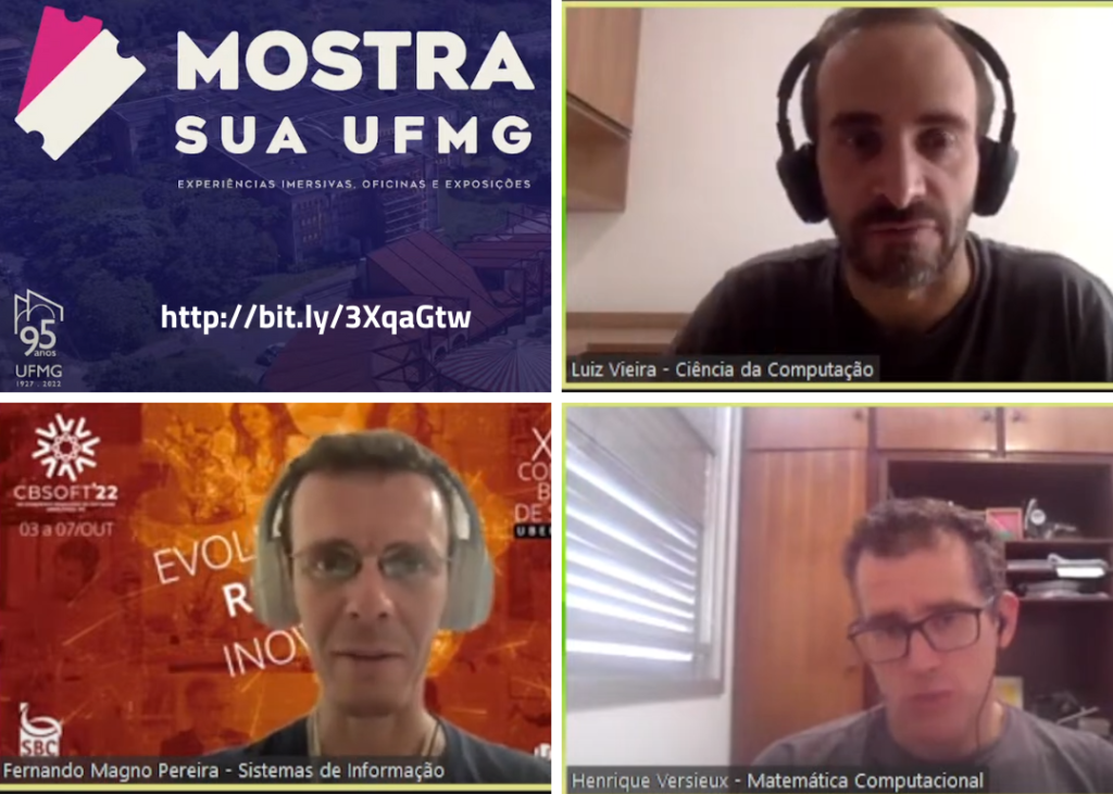 Os coordenadores dos cursos de Ciência da Computação, Sistemas de Informação e Matemática Computacional, professores Luiz Filipe Menezes Vieira, Fernando Magno Quintão Pereira e Henrique Versieux, respectivamente, apresentaram, nesta segunda-feira (21), durante a Mostra Sua UFMG, o perfil dos alunos e as atividades dos cursos oferecidos pelo Departamento de Ciência da Computação (DCC) da UFMG.