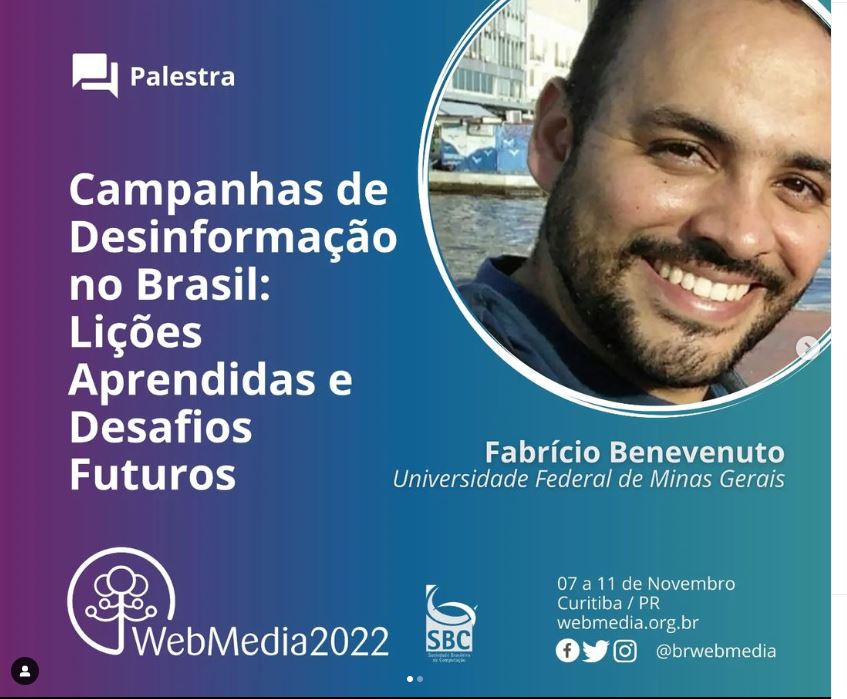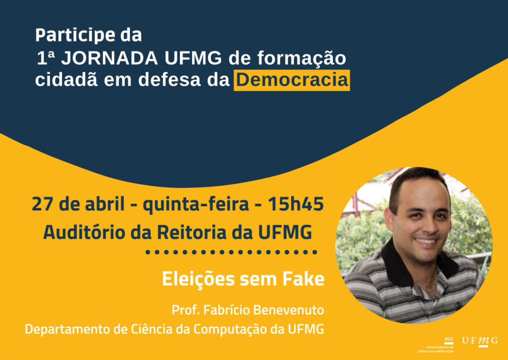O professor do Departamento de Ciência da Computação da UFMG, Fabrício Benevenuto, irá participar, nesta terça-feira, 13, às 14 horas, no Auditório da Reitoria – Campus Pampulha da UFMG, do painel “Programa UFMG de Formação Cidadã em Defesa da Democracia”, com apresentação do projeto “Eleições sem fake”. O evento integra o Seminário “Minas Contra Fake