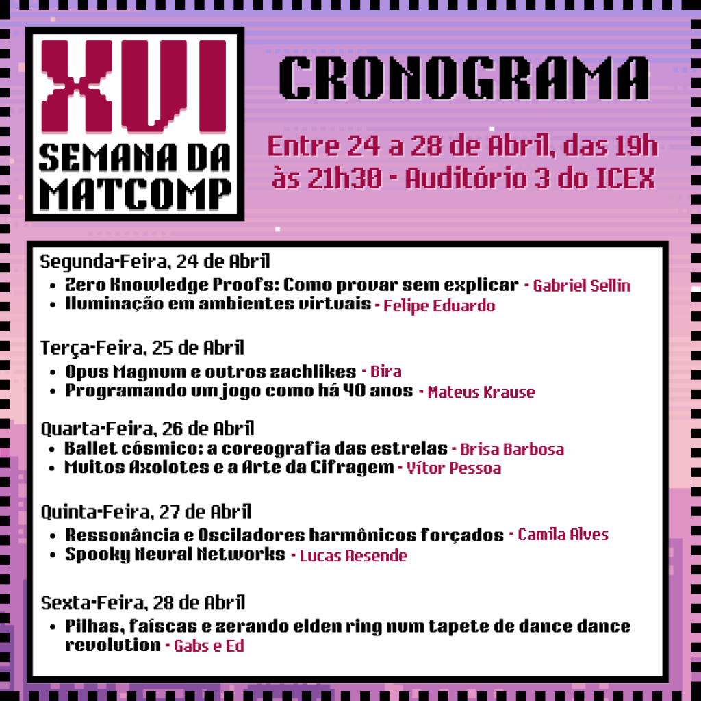 Começou nesta segunda-feira, 24, a XVI Semana da MatComp, um evento voltado a todos que desejam conhecer melhor o curso. As atividades ocorrerão até o dia 28 de abril, sexta-feira, sempre no auditório 3 do prédio do Instituto de Ciências Exatas da UFMG (ICEx). Nessa semana, a partir das 19h e até às 21h30, haverá diversas apresentações com o intuito de ampliar o conhecimento quanto ao curso e mostrar as possibilidades aos graduados na área.