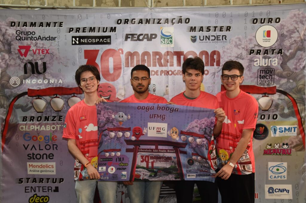 A equipe “ooga booga”, formada pelos estudantes do Departamento de Ciências da Computação (DCC) da UFMG, Gabriel Martins, Gustavo Cruz e Matheus Prates, conquistou o terceiro lugar na final brasileira da Maratona de Programação 2025, realizada no sábado, 9 de novembro, no bairro Liberdade, em São Paulo (SP). O grupo resolveu oito problemas durante a disputa, garantindo a medalha de ouro e a classificação para o torneio Programadores de América 2026, que será realizado de 4 a 8 de março de 2026, em Santiago, Chile.