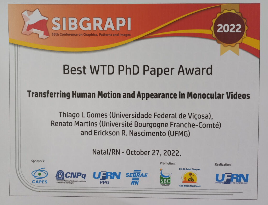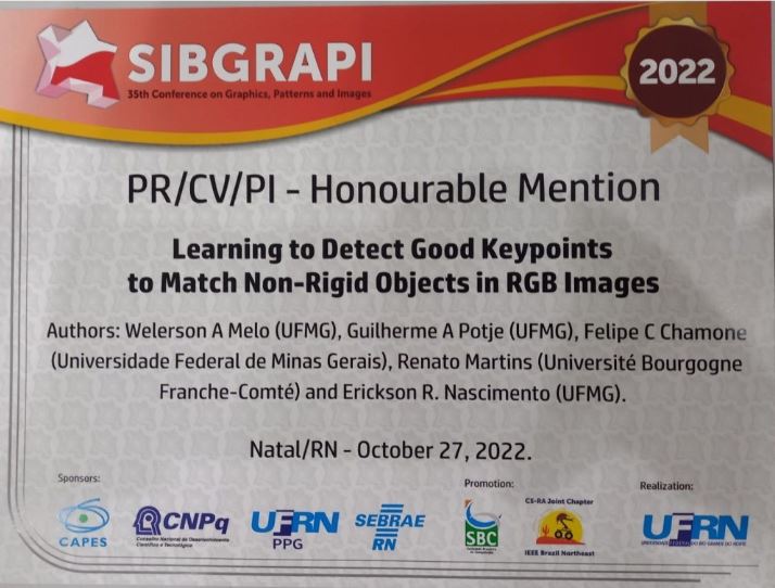 Promovido anualmente pelo Grupo de Interesse Especial em Computação Gráfica e Processamento de Imagens (CEGRAPI) da Sociedade Brasileira de Computação (SBC), o SIBGRAPI – Conference on Graphics, Patterns and Images é um congresso internacional e, este ano, teve a participação do ex-aluno do doutorado do Programa de Pós-graduação em Ciência da Computação (PPGCC) da UFMG, Thiago Luange Gomes, e do aluno do mestrado Welerson Melo. No evento, ocorrido no final de outubro deste ano, Thiago recebeu o prêmio de melhor tese de doutorado no Workshop of Theses and Dissertations (WTD) e Welerson recebeu Menção Honrosa pelo seu artigo, ambos orientados pelo professor Erickson Rangel do Nascimento.