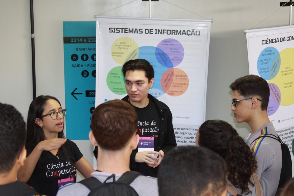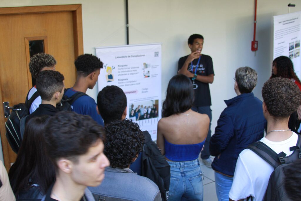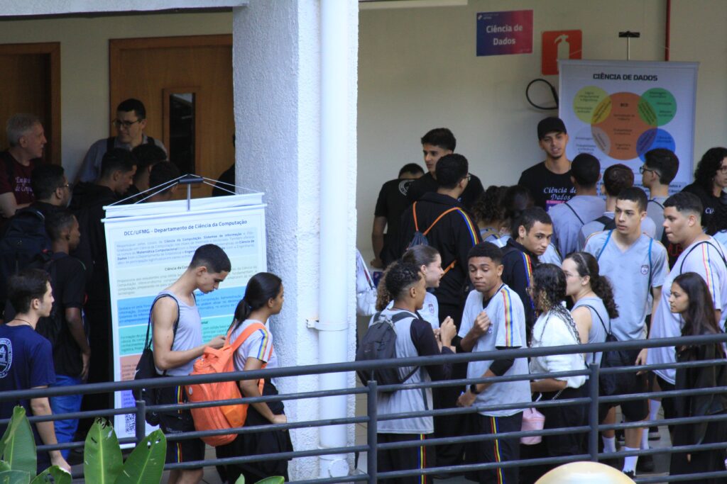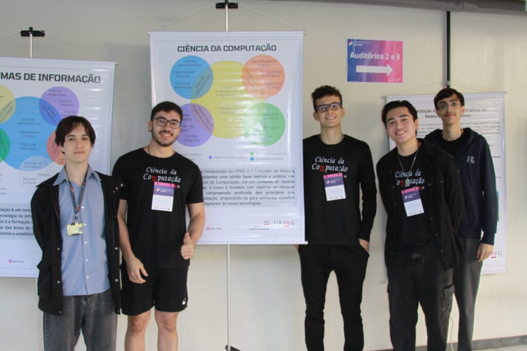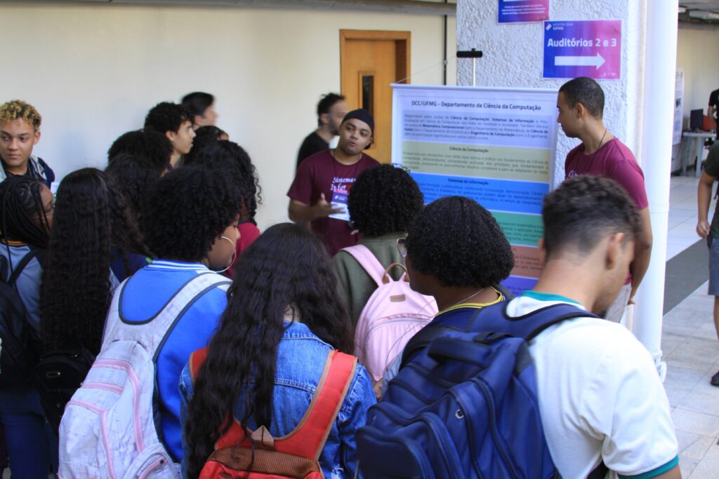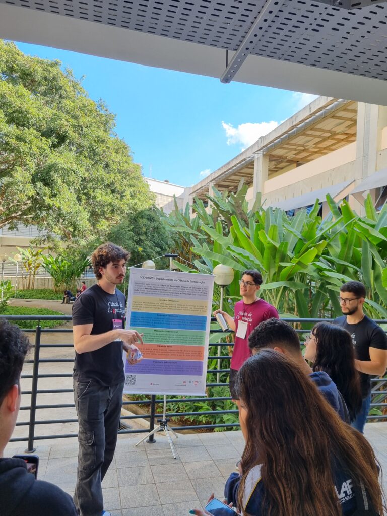 Durante todo o dia, professores e alunos do departamento se dedicaram a mostrar o que faz da UFMG uma referência: mini-palestras explicando os cursos, as áreas de pesquisa, as oportunidades no mercado de trabalho e as possibilidades de transformar vidas com a tecnologia. E não parou por aí! Nos corredores do 2º andar do Anexo U, banners coloridos e informativos chamavam atenção, com os mais de 80 estudantes/voluntários dos cursos prontos para esclarecer dúvidas e compartilhar suas experiências nos laboratórios.