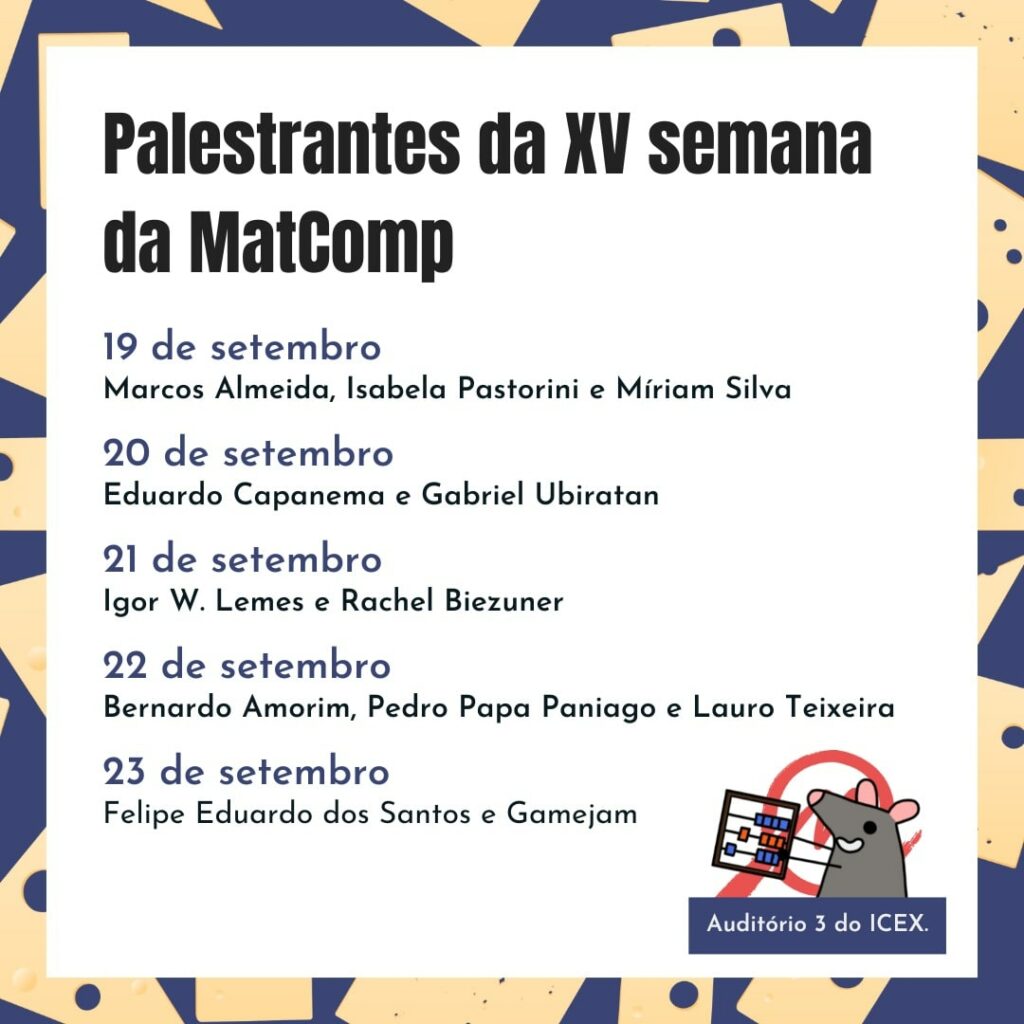 De 19 a 23 de setembro, de 19h às 21h30, no Auditório 3 do Instituto de Ciência Exatas (ICEx), ocorrerá a Semana da MatComp. O evento reunirá calouros e veteranos para discussões sobre o curso, e tem por objetivo apresentá-lo melhor a todos, mostrando possibilidades durante e após a formatura. O evento será interativo e, portanto, os participantes poderão esclarecer todas as dúvidas.